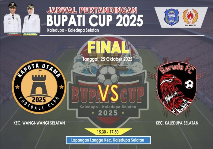 Pertandingan puncak akan mempertemukan kesebelasan Garuda FC dari tuan rumah Kaledupa Selatan (Kalsel) dengan tim perwakilan dari Wangi-Wangi Selatan (Wangsel) yaknik Kapota Utama FC pada Sabtu, 25 Oktober mendatang.