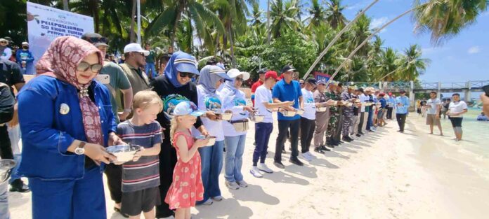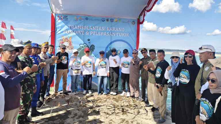 Transplantasi karang itu berlangsung di pesisir Marina Togo, sementara pelepasliaran tukik diselenggarakan di pantai Wambuliga Desa Sombu, Kecamatan Wangiwangi, Sabtu (4/10/2025).